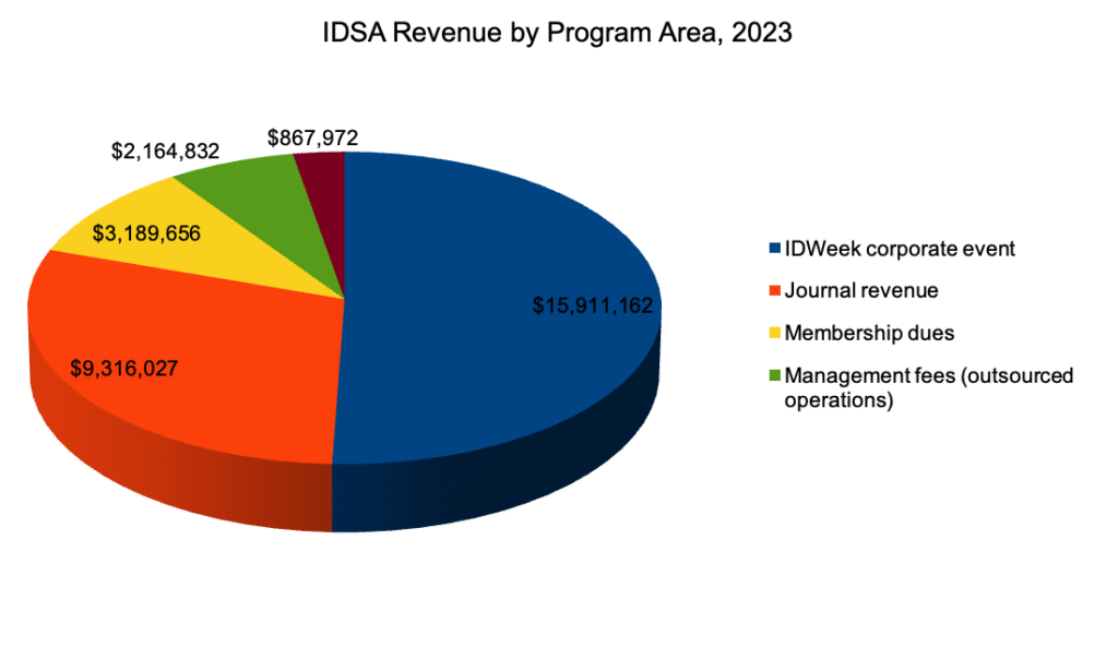 At this point, IDSA needs its pharmaceutical donors even more than they need IDSA. Without IDWeek, the organization would be less than half its current size, its salaries would plummet, and it would have to focus on its journal and its members, something it is no longer built to do. Financially, member dues only account for roughly 10% of the organization's revenues, so presumably accountability to members' interests and needs is only roughly one fifth of IDSA's accountability to industry financiers.