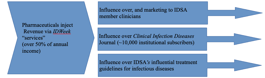 Indeed, IDSA claims that it is composed of well-meaning and independent scientists who give their honest opinions about how infectious disease programs should be run, which drug should be prescribed, and how infectious disease should be tracked, managed, and prevented. This charity, we are told, has an independent, ethically run in-house journal CID, published by Oxford Press, which universities around the world subscribe to, and keep in their libraries. And academics and doctors, unpaid by IDSA but invited to their committees to do the actual guideline-drafting work, likely believe this is the organization's primary role.